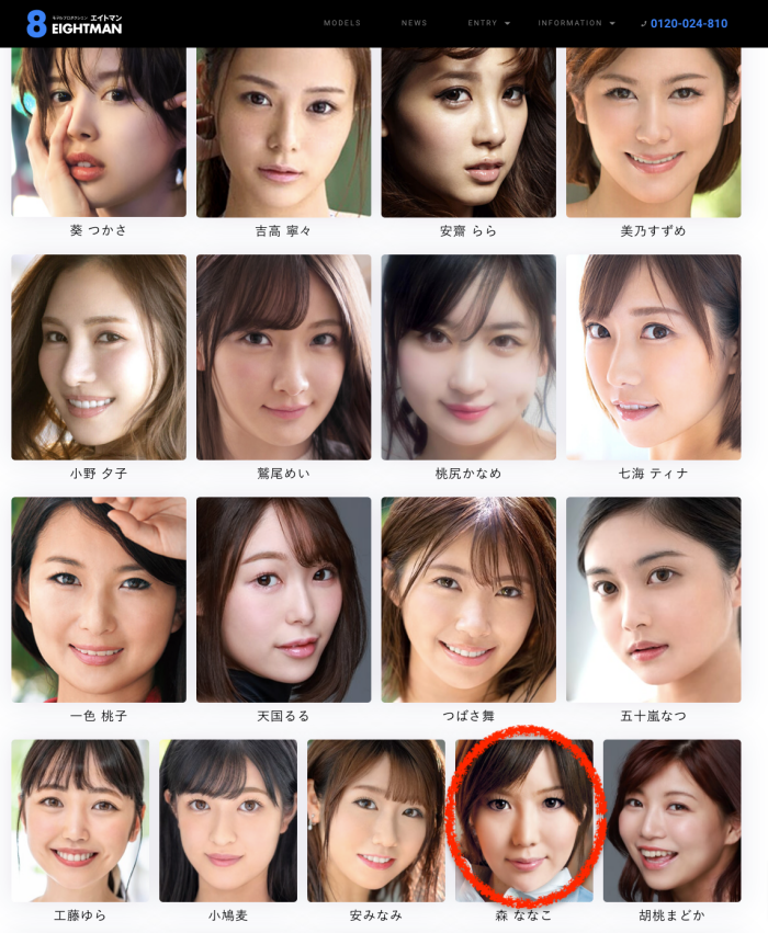 那現在的森ななこ(森奈奈子)是什麼狀況?蠻有趣的,雖然好一陣子沒有新作,但事務所8MAN最新出爐的名片還是有放她的照片,甚至在官網女優陣容中她的排名還在胡桃まどか(胡桃圓)之前,並沒有和那些已經引退的女優放在一起,連經紀人也說歡迎海外廠商提Offer,他們會問問森ななこ(森奈奈子)有沒有興趣參加⋯