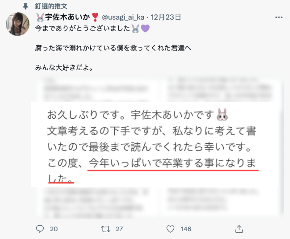 因為宇佐木あいか(宇佐木愛華)就和昨天的東希美一樣,只是來告知大家自己不做了ー早在暑假的時候她就和事務所表達辭職的決定,10月後也不再更新社群,昨天的聲明雖然說是2022就不幹了,但實際上她早就脫離戰場了〜