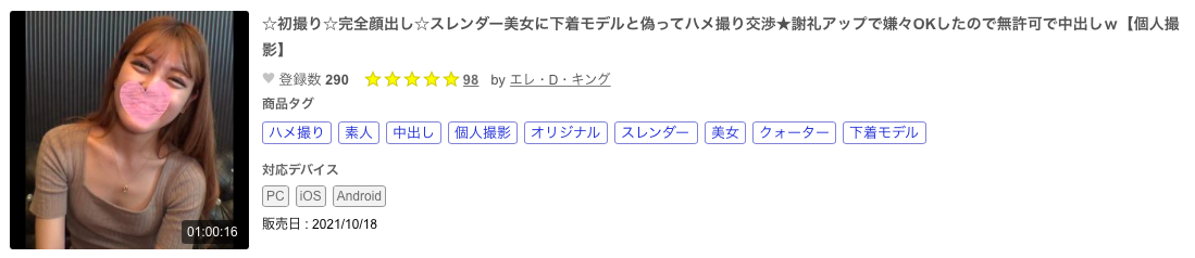 那就是番號FC2-PPV-2355952的作品「☆初撮り☆完全顔出し☆スレンダー美女に下着モデルと偽ってハメ撮り交渉★謝礼アップで嫌々OKしたので無許可で中出しw【個人撮影】」:大島せな(大島瀨奈)實在太好認了,左邊下巴和胸部中間的痣一比對就知道是她,而且這支作品她全程露臉演出,可說是非常有誠意⋯