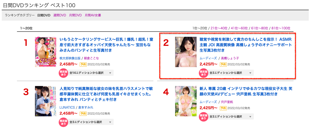 還好,雖然沒有拿下昨天的第一,但至少還是第二,也還OK,而隨著2022年的到來,相信大家都看到高橋所屬的片商Moodyz近來是專屬女優連發,從「新一代美少女」石川澪開始、包括「一萬人追蹤就出道」花芽ありす(花芽有朱)、「神乳」明日見未来、「寫真明星」三田サクラ(三田櫻)、「只被插入0.5公分」的佐久良咲希以及才剛出道宍戸里帆個個都是強者,這也讓人不禁擔心是否高橋しょう子(高橋聖子)共主的地位不再?