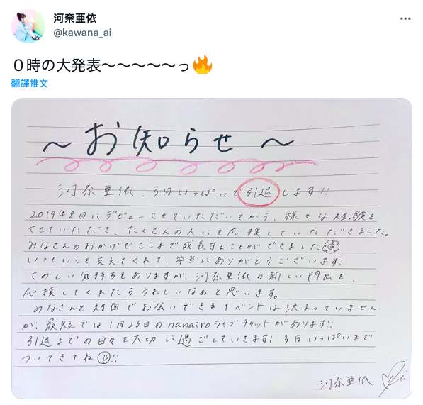 沒有埋怨,只有滿滿的感謝,河奈亜依宣布將會在3月的時候引退,由於肺炎疫情又爆炸,所以她還沒辦法確定有沒有面對面和大家告別的機會,只能先透過直播說再見〜