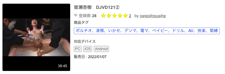 像番號FC2-PPV-2560770的「皆瀬杏樹 DJVD121②」就讓流出大軍再添一人ー這是作品「女体拷問研究所 THE THIRD JUDAS Episode-21 蒼天の令嬢捜査官が逝き狂う神秘 暗闇に沈む淫靡なるサラブレッド」、番號DJUD-121的其中一小段,預覽影片可以看到被五花大綁的她小穴完全暴露,一覽無遺〜