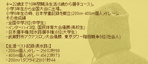 他的真實身分是泳池教練「佐野公英」:名字一出來他的個人資料也全被扒了出來(所以女優有多怕個資曝光你知道了),他4歲開始學游泳,小學3年級就參加日本全國大賽,6年級創下了200公尺和400公尺的全國紀錄;到了國中、高中他的表現仍然優異,直到大學才因為沒有突破而自賽場退役⋯