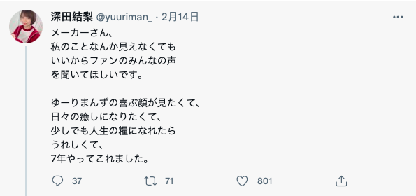 我猜很多人的答案會是「無碼片」,同樣的問題也讓深田結梨非常好奇,出道七年的她在twitter是這麼寫的:「7年的AV生涯,重口味的企劃演多了,自然也就什麼會了,但粉絲真的喜歡那樣(重口味)的演出嗎?」