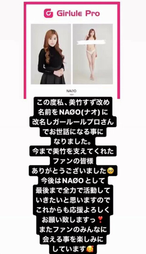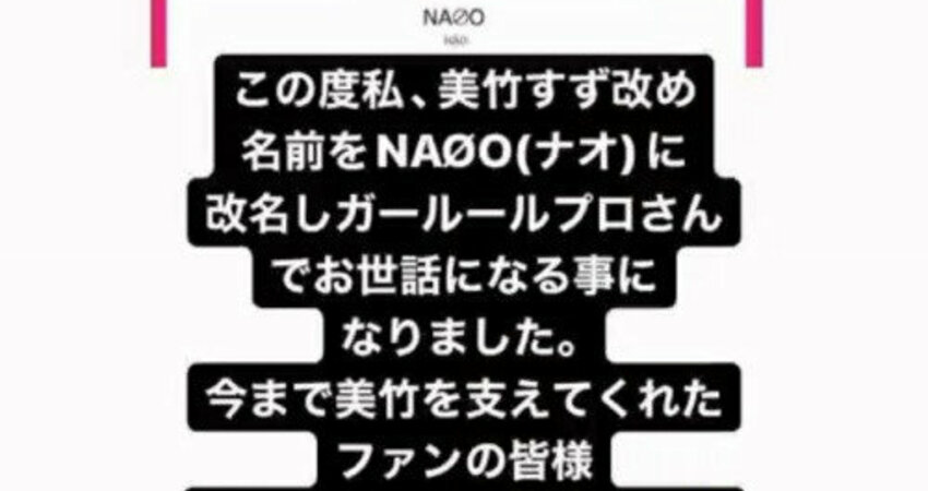 有了新的事務所,藝名自然也要換,離開之前的經紀公司時她就說放棄了美竹すず(美竹鈴)這個自出道以來一直跟著她的藝名,而到了新的事務所,想了又想,她決定搞怪一下,把藝名改為「NAØO」:
