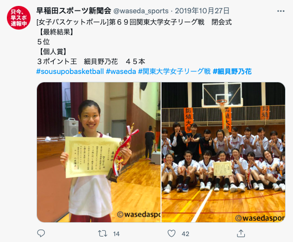 她是早稲田大學出身的三分球王「細貝野乃花」!