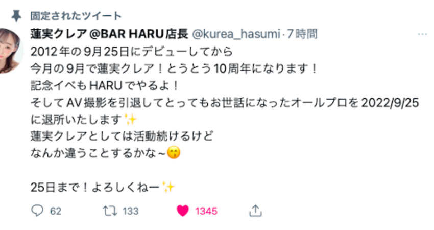 著名的痴女、也曾來到台灣參加成人博覽會及攝影會的女優「蓮実クレア(蓮實克蕾兒)」今天凌晨發表了AV引退宣言,除了不再拍片,在9月25號、出道10週年的時候她也要退出經紀公司AllPro: