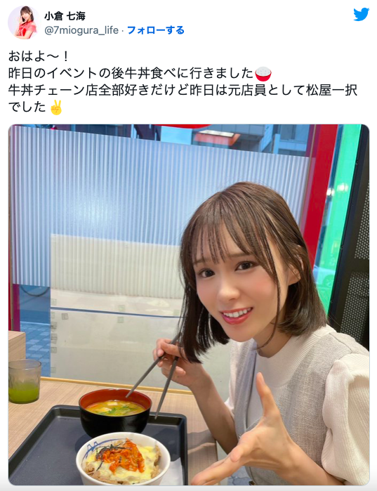 蠻有趣的,一般提到小倉七海,各情報誌大多是以「元スポーツ飲料CM女優(前運動飲料廣告明星)」來稱呼她,想不到這位發展很好的女優自爆是松屋打工人,然後她順便也小小批判了日本社會對女性獨自一人吃牛丼或拉麵的歧視心態,要大家不要覺得這些女性很奇怪~