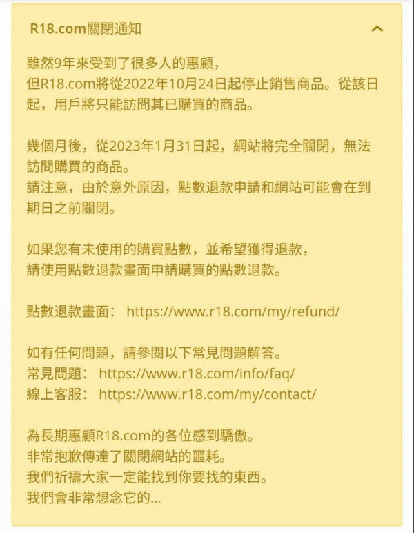 畢竟是曾經合作的廠商,看到這樣我也蠻難過的,但更多的是心疼ー心疼誰?心疼那些在R18消費的朋友們,從關站公告來看之前購買的作品會跟著一併消失,什麼都不剩⋯