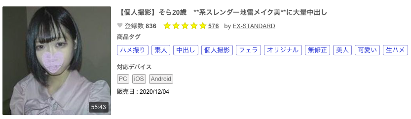 像這位「【個人撮影】そら20歳 **系スレンダー地雷メイク美**に大量中出し(FC2-PPV-1588966)」就是她,而FC2-PPV-1744288這片她更是連臉都不遮了直接賣片,還有還有,與賣家「ハメま專科」的合作她則是換上了啦啦隊員的制服以SSS級キャル(SSS級辣妹)的身份出場(FC2-PPV-1821096),然後與BigBang、下心俊介、デッドボールPORN以及All Stars這些賣家都有合作ー這位風俗出身的同人AV女優優勢很清楚,就是辣妹的外型、纖細的身材以及因為平常工作方便所以寸草不生的下半身,而且她沒有一般女優不知道怎麼面對鏡頭的問題,甚至看到鏡頭會更加興奮所以演出效果很好,所以在無碼賣家間名氣很大,眾人都樂於合作〜