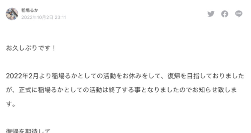 今年二月休業,一直說會回來的「稲場るか(稻場流歌)」昨天在Note上宣布自己食言了,除了和影迷道歉外她也說自己找到了一般的工作,所以⋯