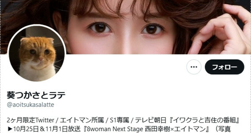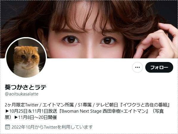 不要懷疑,這個「葵つかさとラテ(葵司與拿鐵)」的帳號就是本尊經營的,ラテ(拿鐵)是誰呢?就是她頭像的那隻貓,葵つかさ(葵司)是要藉此告訴大家她是個貓奴,這個twitter帳號會發很多很多貓的照片⋯