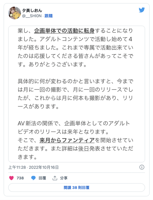 今天,她在twitter告訴大家,自己與OPPAI的專屬契約已經結束,她不再是任何一間片商的專屬女優,從今以後將要以企劃女優(キカタン)的身分闖蕩江湖了⋯