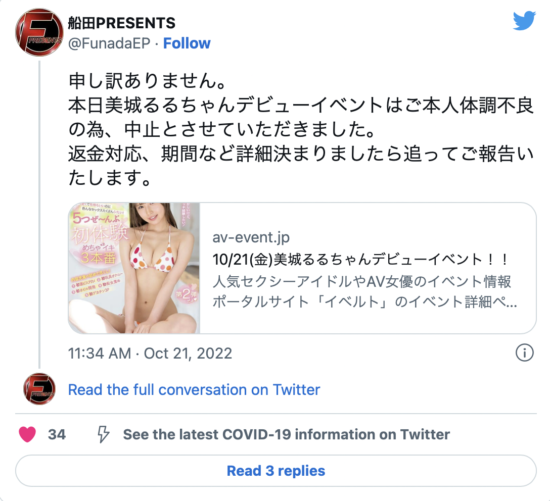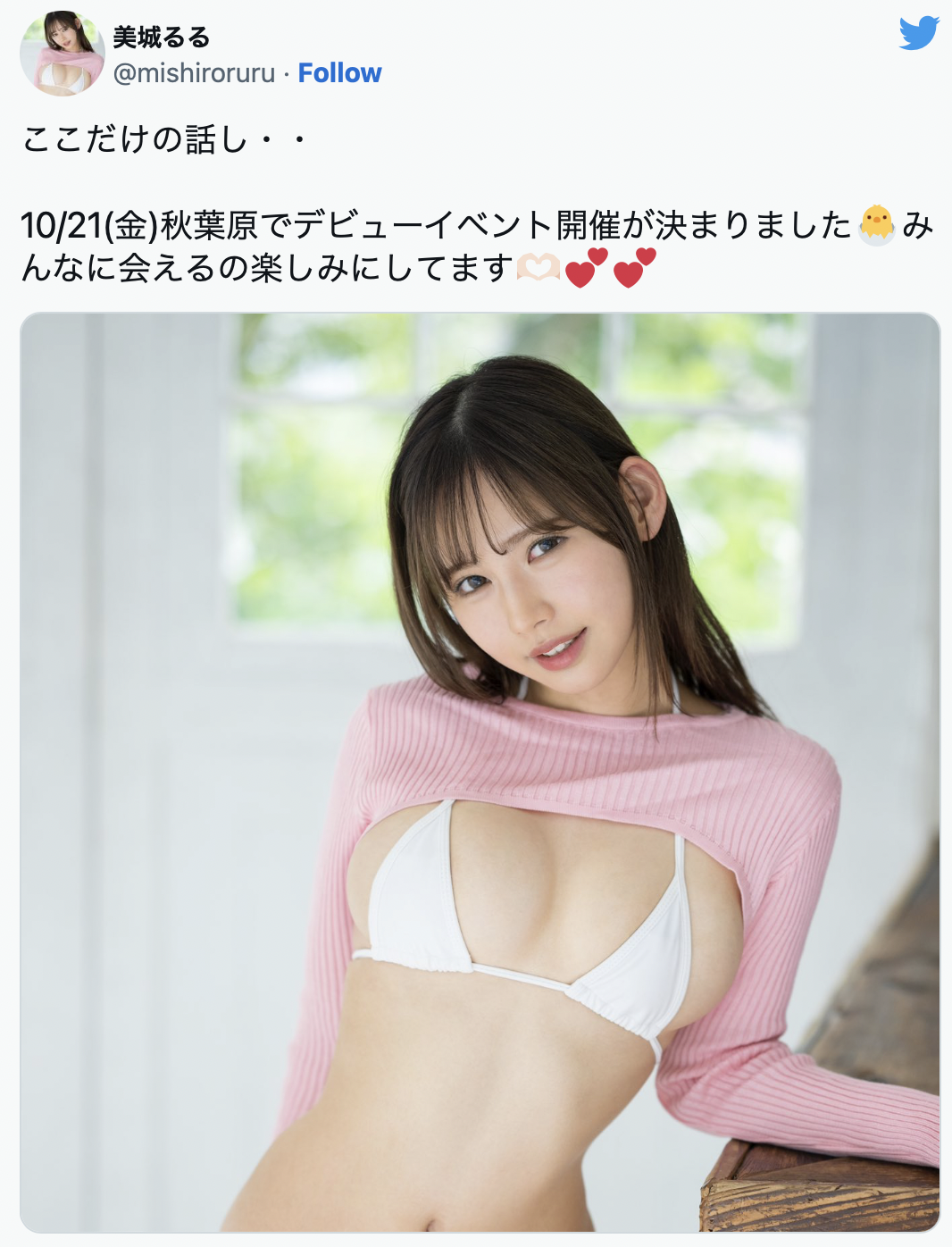 一樣是片商kawaii*,這次出問題是非常被看好的新人「美城るる(美城露露)」,9月中的時候,她宣布要在10月21日時舉辦出道以來的第一次見面會,因為條件真的不錯,所以9月30日發售的票券在10月3日全數賣光,大家都很Happy〜