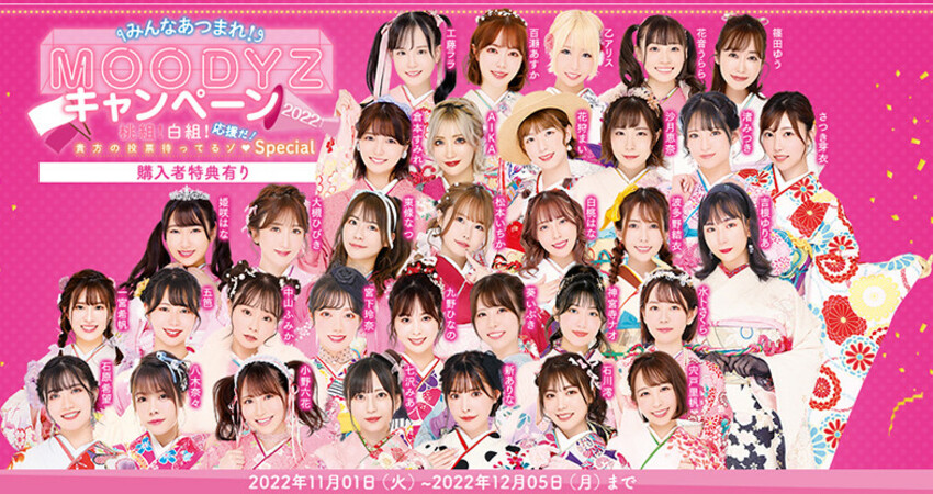 至於這個宣傳活動怎麼麼玩呢?因為幫忙宣傳的女優很多,所以Moodyz把女優們分成了桃組和白組展開競賽:桃組是由新ありな(新有菜)站在C位,白組則是讓七沢みあ(七澤米亞)站在中間,Moodyz是由通販(實體作品65折起,多買還送特典影像)、500円(台幣110元)的MOODYZキャンペーン2022 specialDVD、原創商品(File夾、生写真套組、人形立牌)以及女優身上的泳裝拍賣來看看白組桃組誰的人氣高,另外,還有數位寫真集發售、女優也會參加線上聊天室宣傳這個促銷活動,最後還與電玩遊戲連動,你可以在遊戲中使用Moodyz的女優打天下: