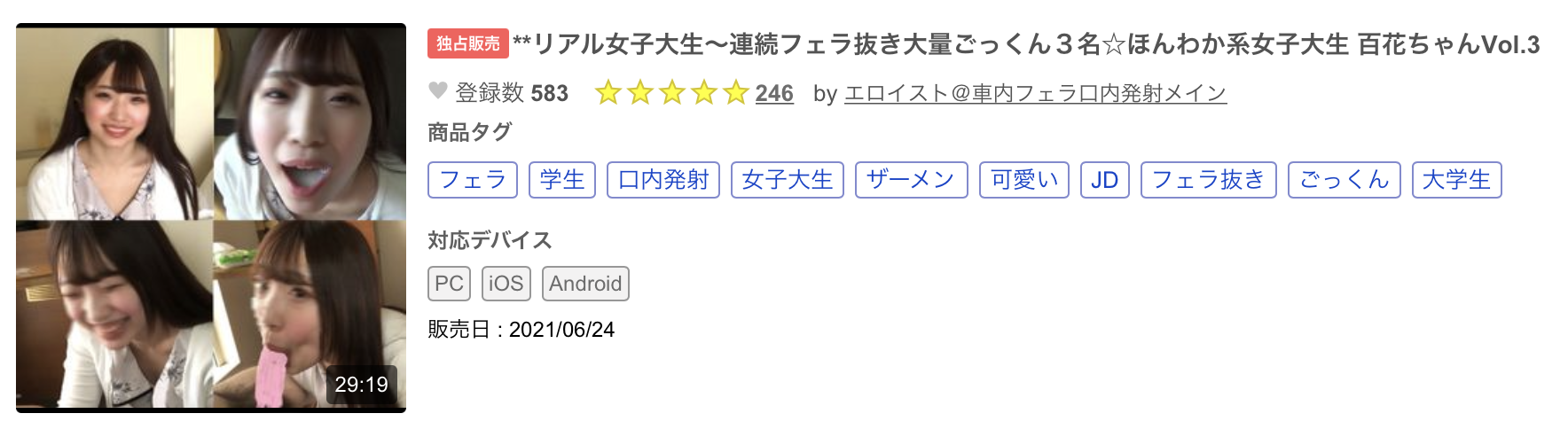 比方說「完全顔出し★色白清楚の18歳現役女子○生!ちんぽ見ただけでぐちょぐちょ濡らす・・・」(FC2-PPV-2067879)是她,用「百花」之名演出「**リアル女子大生~連続フェラ抜き大量ごっくん3名☆ほんわか系女子大生 百花ちゃんVol.3」的也是她(FC2-PPV-1886126),另外她還用至少六個藝名與不同賣家合作在FC2發售無碼作品,我還沒算有些作品下架了喔⋯