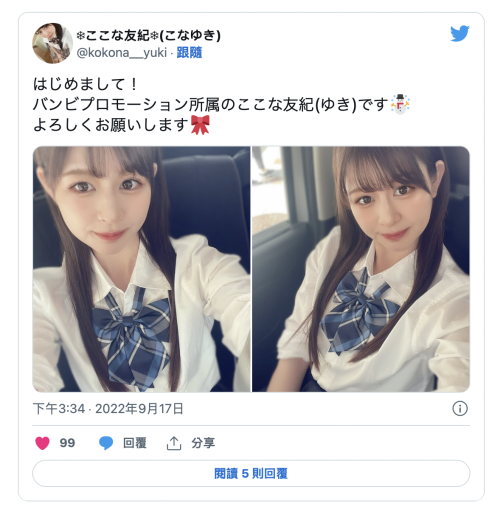 其實她的外型和演出都蠻不錯的,只可惜當時她沒有社群、拍完出道作人就不見了,直到9月她才用ここな友紀(心花友紀)的名字回歸⋯