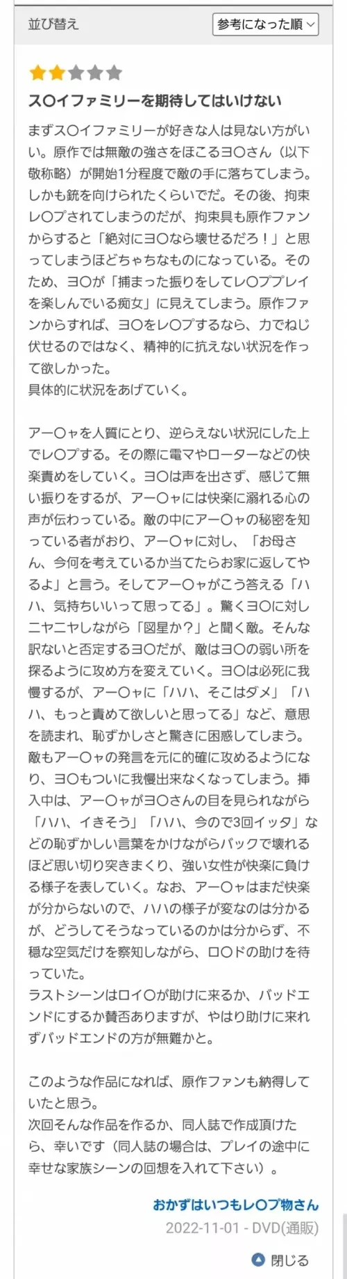 看看人家留的言,標題直接就講了「ス〇イファミリーを期待してはいけない(喜歡間䜓家家酒的影迷千萬別指望這支作品)」,因為在片中無敵的ヨル(約兒)不到一分鐘就被撂倒然後上刑具開始凌辱ー留言的粉絲說,ヨル(約兒)在原作中實在太強太強了,但在片中被槍一指然後一個手刀就被打暈任人幹,看起來就像是個故意被抓想吃棒子的蕩婦⋯