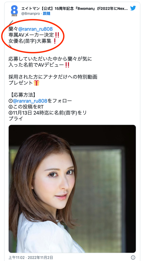 在官推上,8MAN宣布答案了,蘭々、専属メーカー決定(專屬片商確定了)!