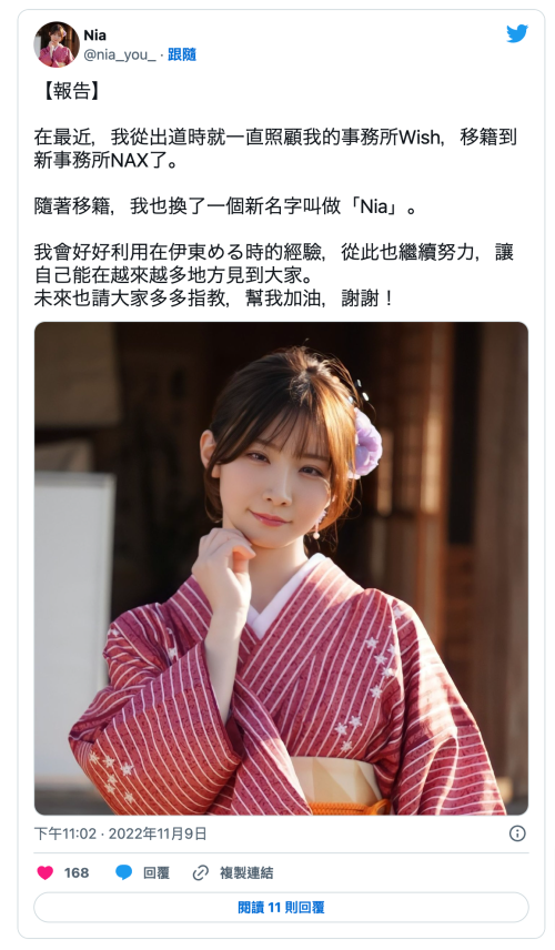 算了,回來就好,剩下的再說吧,只要還想做那移籍換事務所也是一個選項,像台日混血的「伊東める(伊東愛瑠)」就在昨天宣布更換事務所為NAX,也將藝名更改為「Nia」: