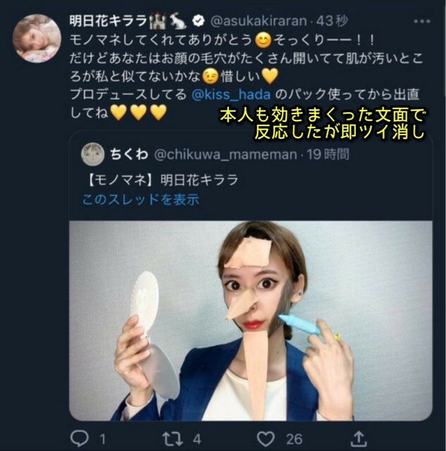 來看明日花キララ(明日花Kirara)是怎麼回的:首先,她說非常謝謝ちくわ的模仿,「真是有夠像的」;接下來明日花話鋒一轉,說ちくわ毛孔粗大,皮膚又髒兮兮的,這和注意保養的自己就不怎麼像了,所以她建議這位Youtuber使用自己企劃的面膜好好敷臉,狀況很快就能改善〜