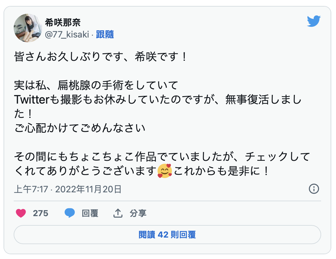 她說了,是因為扁桃腺手術的原因,所以沒拍片子也暫停更新twitter,現在她身體已經康復了,之前拍的片子也陸續上市,請大家多多支持〜