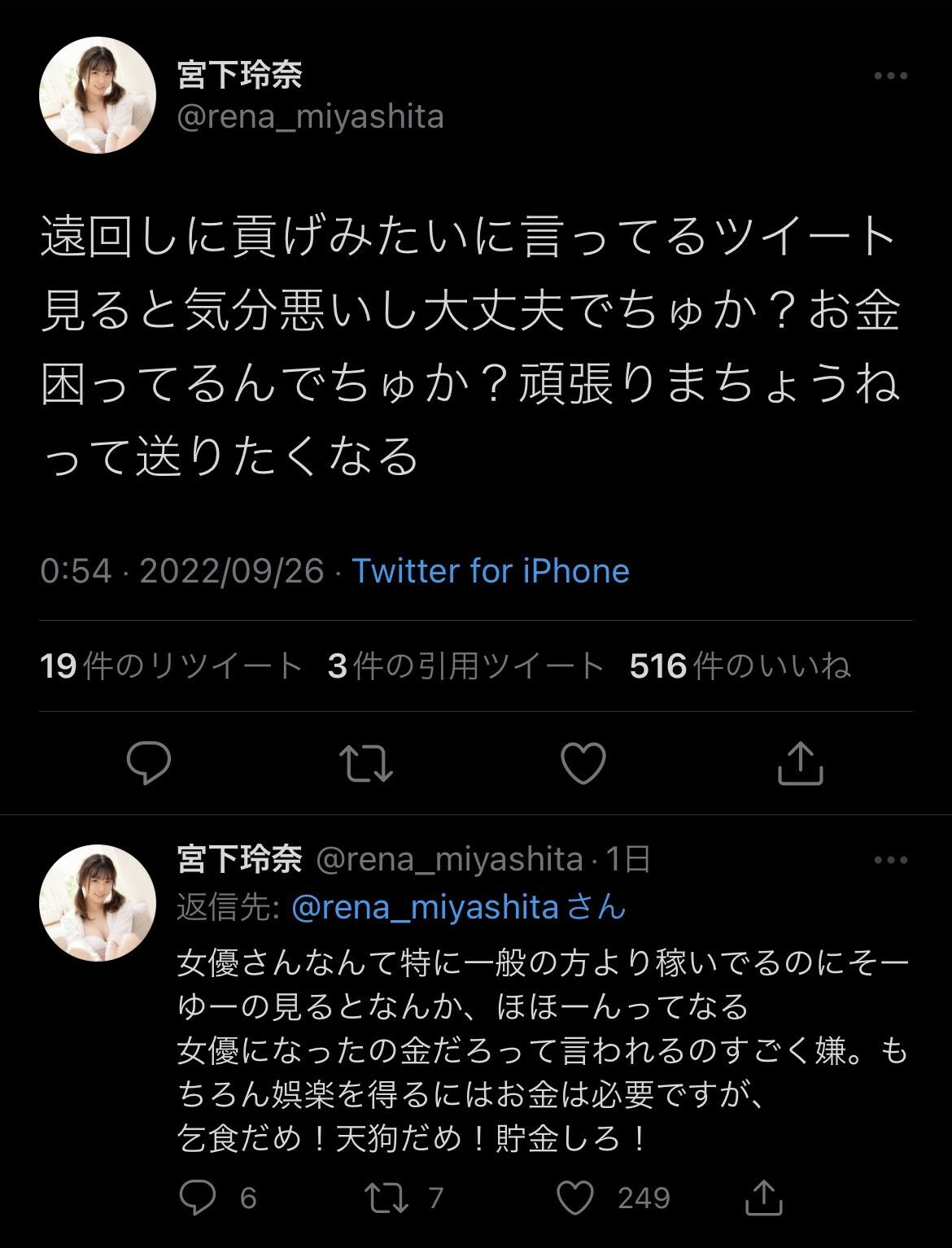 公開兩人對話,ほしののの(原 小倉七海)要為自己討個公道,同時再一次強調自己因為AV新法以及下體流血不止的健康問題導致無法工作沒有收入只好退出事務所經營付費粉絲團,絕對不是賣慘;而另一方面宮下玲奈雖然把原文刪了,卻也說不後悔寫出那些東西,封鎖對方只是因為懶得和有被害妄想症的可憐人糾纏: