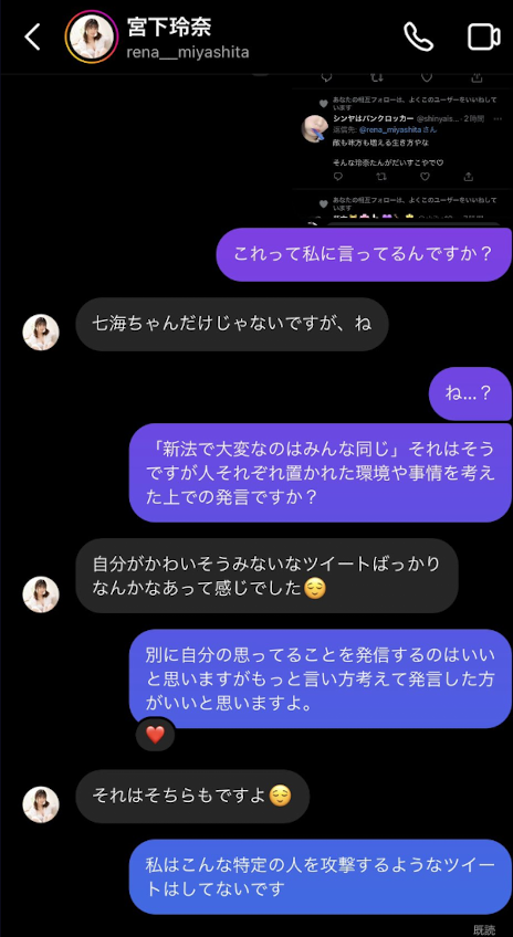 結果ほしののの(星野乃乃,原 小倉七海)就自己對號入座了:她私訊給宮下玲奈詢問那篇發文是不是在批評自己?同時也希望對方在發文前能夠考慮其他人的心情,結果宮下玲奈一副誰答聲我就說誰的態度讓她超不爽的,就當她還想再戰下去的時候,發現自己被宮下玲奈封鎖了〜
