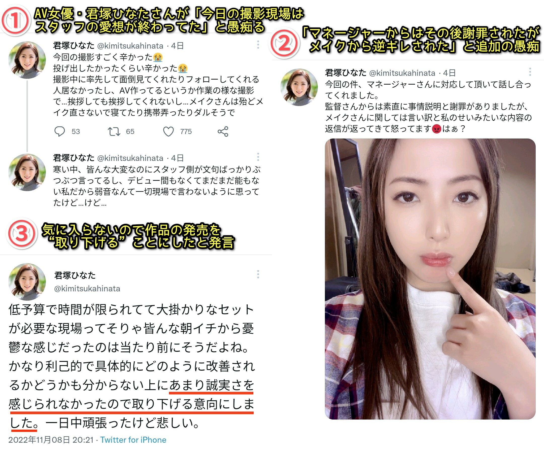 她在twitter上說那位被嫌棄的化妝師是個好人,倒是那位老是找化妝師麻煩的女優最好適可而止,很多人都受不了她了ー然後君塚ひなた(君塚日向)不忍了立刻對號入座,除了指責月島さくら(月島櫻)根本不知道發生了什麼事、她也從來沒對其他化妝師不滿外雙方自然又是針對月島始終反對的AV新法有了一番「交流」: