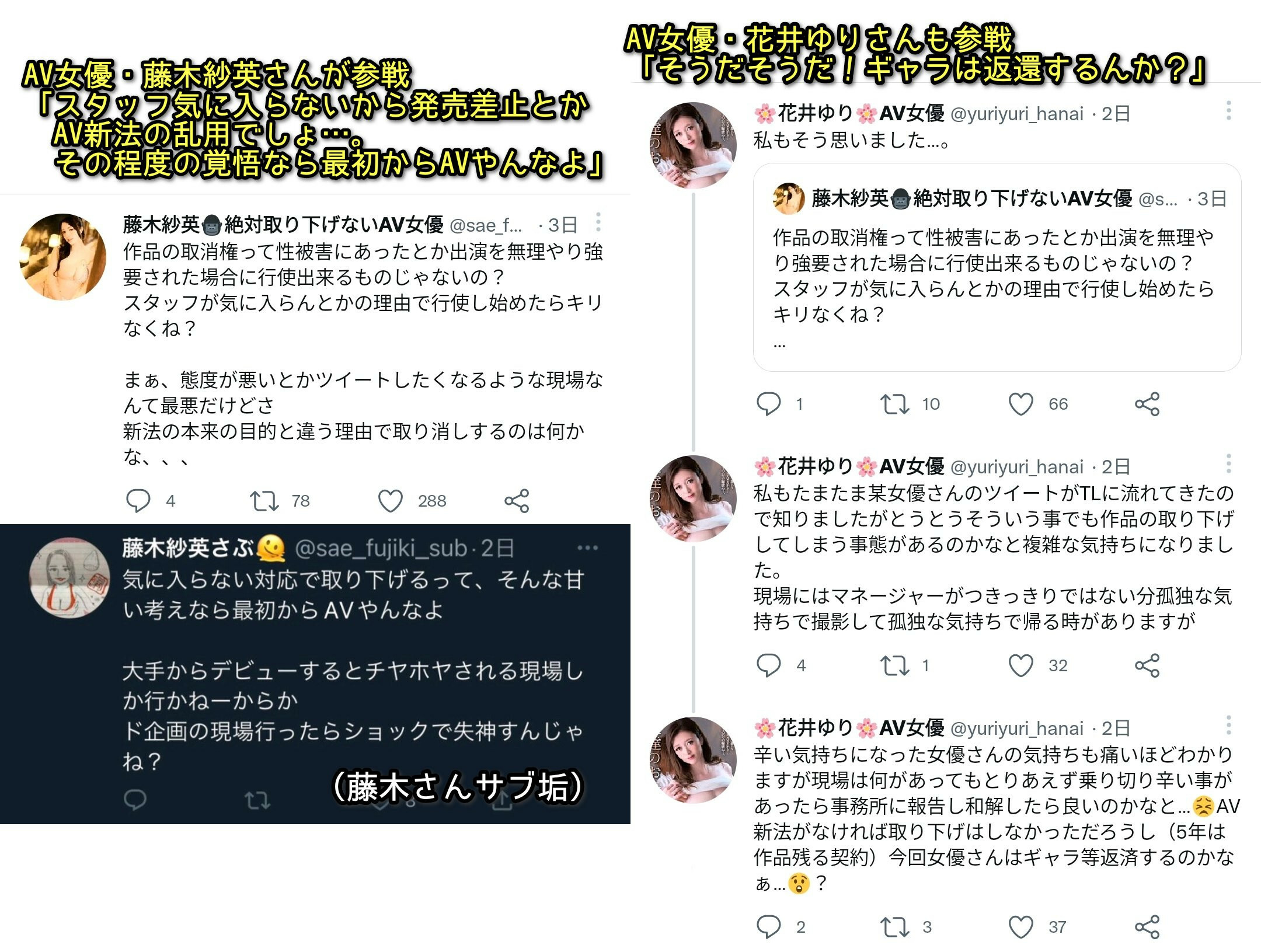 藤木紗英立刻在twitter指責這種作法是濫用新法賦予女優的權利,她說AV新法主要目的是防止女優被強迫拍片或是拍攝她們不同意的內容,不是給那些拍得不爽的人胡亂使用的(對,藤木紗英沒有指名道姓),然後她愈想愈氣,後來放大絕說如果這樣子就要把作品下架的話那你不如一開始就別來拍AV了;另一位女優花井ゆり(花井百合)也附和藤木紗英的說法,在自己twitter說如果真的要把作品下架,那某女優(也是沒有指名道姓)是不是該把片酬還給片商?