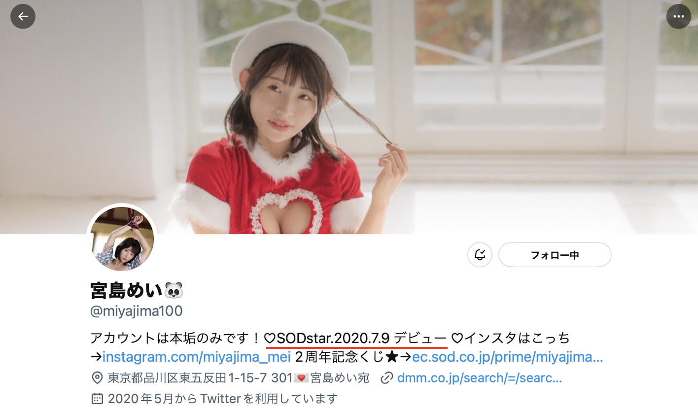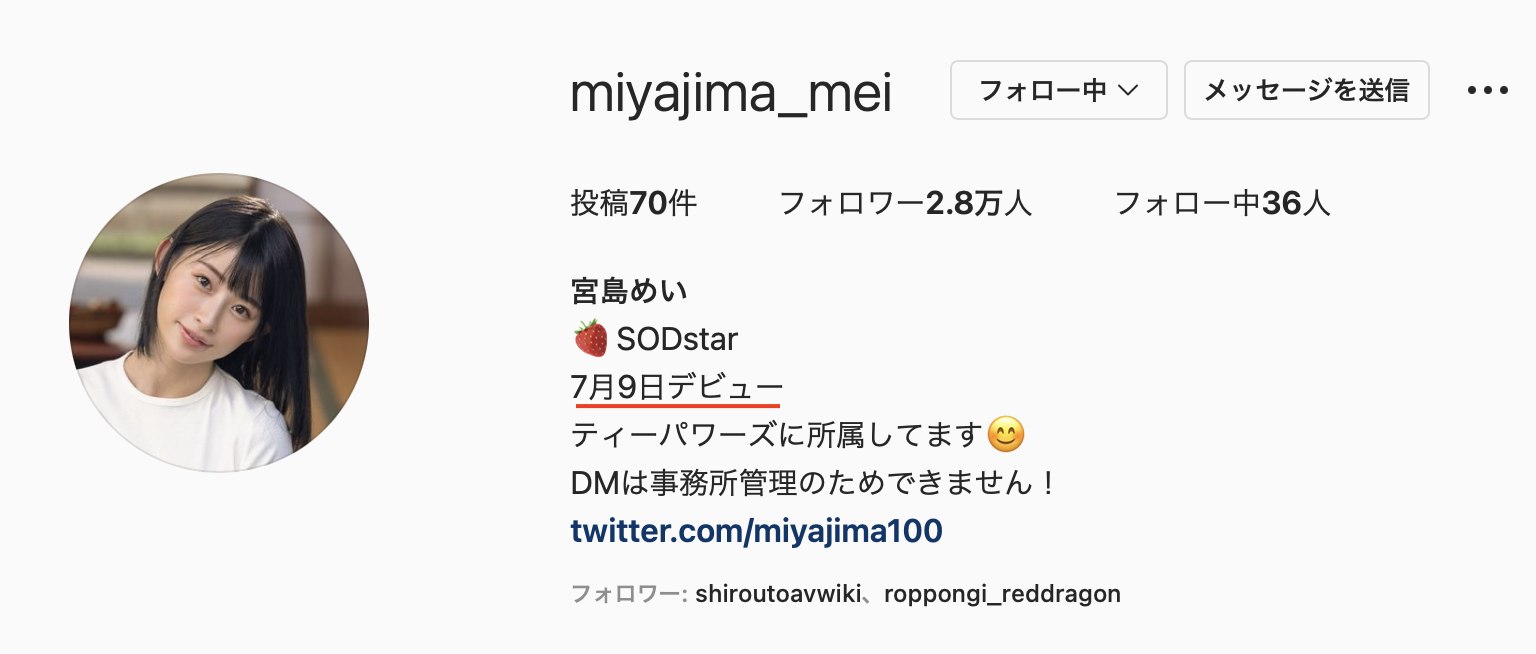 自己問自己答,宮島めい(宮島芽)真的有些怪怪的:首先,她的twitter只寫了是在SOD Star出道,並沒有寫是他們的專屬女優,在IG也多了一句「T-Powers(經紀公司名)所屬」,這不對啊,之前她可是在twitter的自我介欄欄多次強調她是SOD Star所屬和專屬,現在把那些話都修掉了然後又活跳跳自拍影片,怪,真的很怪。