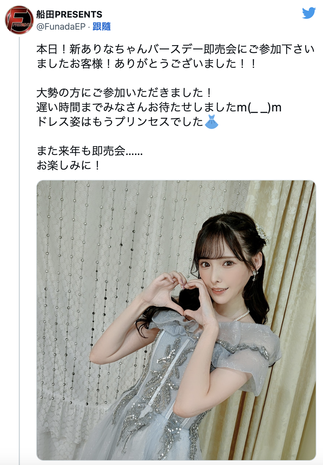 肺炎疫情逐漸步向共存,AV界也開始很認真地舉辦活動,而這根本是考驗人氣的殘酷舞台ー不過對換了片商、改了藝名、之前在Faleno時深居簡出不太發聲的新ありな(新有菜)而言完全沒影響,昨天晚上(12/15)的即售會她就展現了實力: