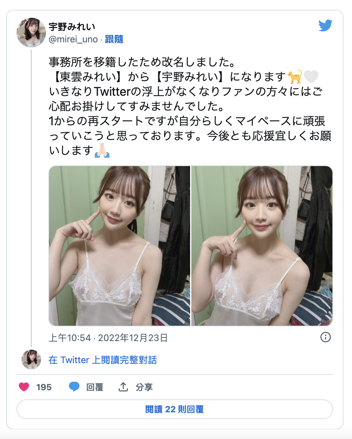 在自爆twitter是被「前事務所」更換密碼所以進不去後,東雲みれい(東雲美玲)更換經紀公司是在所難免了,果然,她也沒讓大家等太久,新的twitter成立的同時也宣布新東家了: