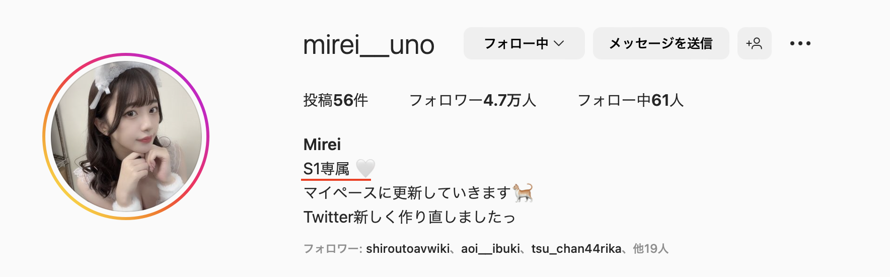 和我之前的預測一樣,她保留了みれい(美玲)的名字,改姓宇野後就不會和那個做模型的搞混了。至於她還是不是S1的專屬女優呢?從她twitter和IG的自我介紹都把「S1専属」擺在最前面我認為是的,就算不相信她說的也要相信Arrows背後的All集團實力: