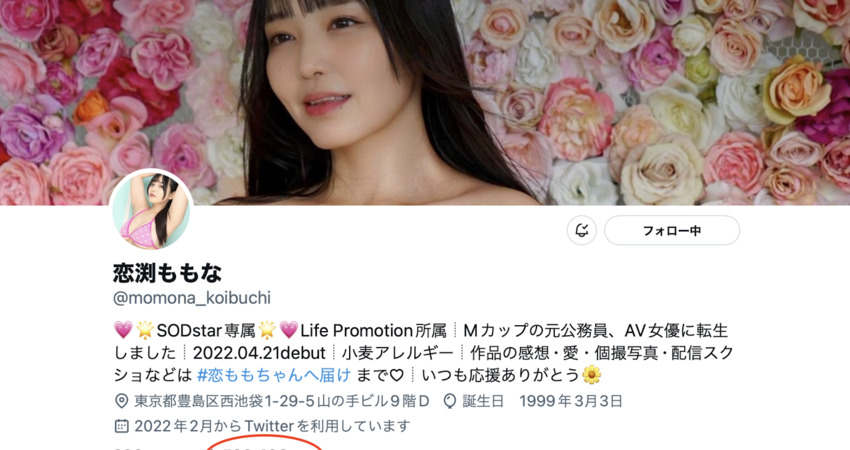 昨天提到山手梨愛發展成功,一年多下來她的twitter有超過48萬追蹤真的超厲害,但其實這一年社群經營最成功的新人並非是她,而是SOD Star的大奶妹「恋渕ももな(戀渕桃菜)」:
