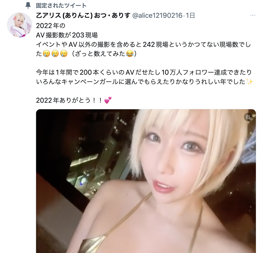 她自己在twitter上寫了,2022年,「AV撮影数が203現場」,意思是她參加了203場的AV拍攝活動ー在這邊解釋一下,這裡指的是乙アリス(乙愛麗絲)得到了來自不同片商總共203場的拍片通告,但這裡有網路片商、有片商合輯和共演的邀約、意思是雖然可以說她拍了203片,但一來不是每一支作品都有DVD、二來不是每一支作品都由她一個人主演到底,再加上她的銷售成績相較於最頂級的那一群稍微差一點,所以大部分的朋友可能沒想到她有這麼強⋯