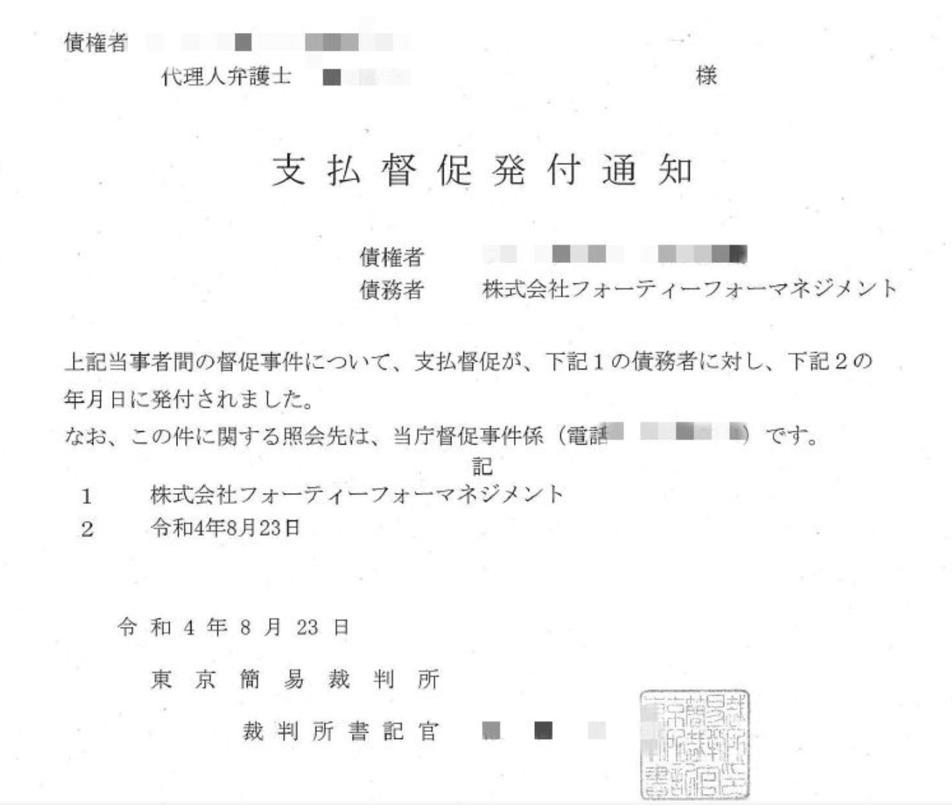 A先生非常火大,於是請法院寄送還款通知,結果フォーティーフォーマネジメント(44Management)的辦公室沒人收信(這很正常,事務所不是什麼時候都有人在的),接著A先生把催繳文件直接寄到社長家裡,但一直沒得到對方回應,最後實在受不了於是A先生決定強制執行,扣押了フォーティーフォーマネジメント(44Management)的公司帳戶⋯