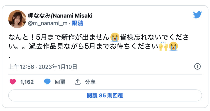 但沒有女優像岬ななみ(岬奈奈美)那麼嚴重的,這位非常受歡迎的戲劇好手在twitter上寫了,在今年5月前不會有作品,請大家千萬別忘了她〜