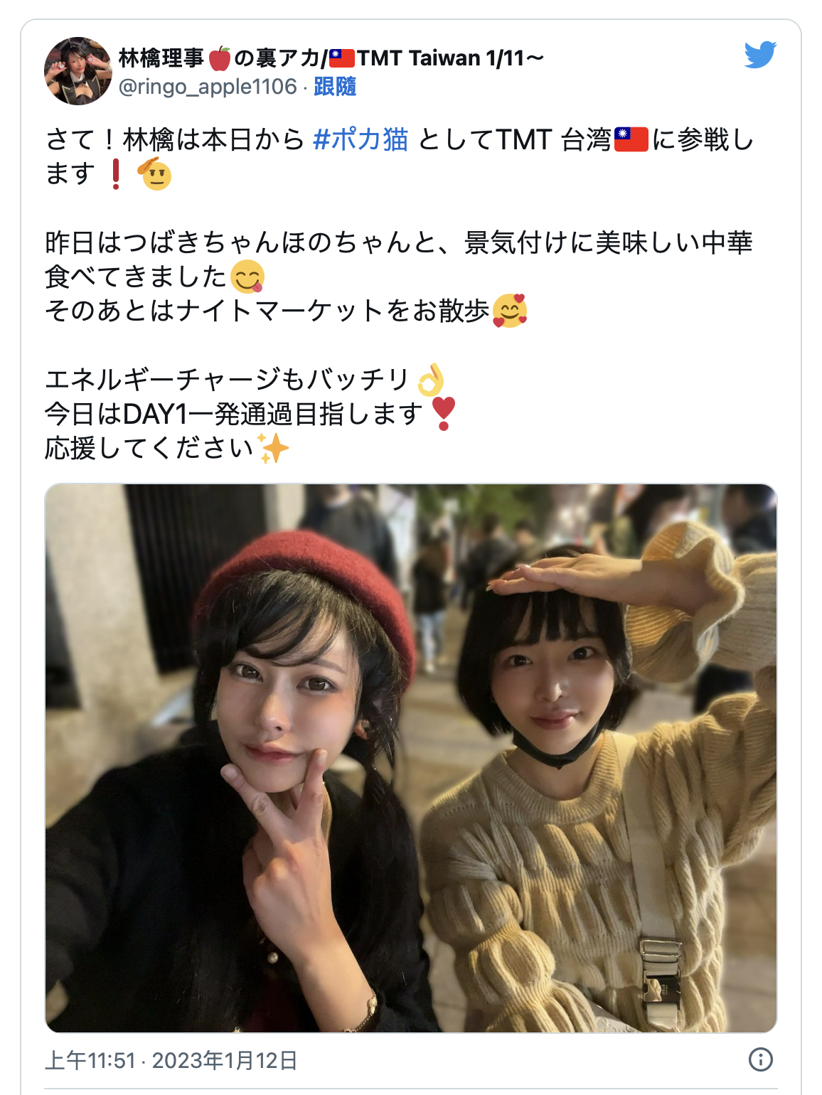 可能有些人會覺得奇怪,三宮つばき(三宮椿)?她是什麼時候來的、現在又在哪裡?在她twitter的主帳號是找不到這些訊息的,不過到了小帳(https://twitter.com/tsubaki_poker_)就知道她昨天(1/11)就來到台灣了,只是和miru來台灣舉辦活動不同,三宮つばき(三宮椿)是來參加比賽的〜