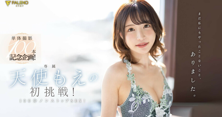 那麼就讓我們來看看她的第100支作品吧:FALENO推出的是「台本無し!演出無し!100分ノンストップSEX!」,也就是說沒有劇本、不用演技、100分鐘不喊卡連續幹ー其實我覺得這企劃不錯,一來天使もえ(天使萌)是老江湖了,雖然最近愈來愈浮誇,但要她在鏡頭前連嗨100分鐘無限暢打絕對沒問題;而且FALENO也很夠意思,找來搭配的都是資深男優如「開箱王」貞松大輔、「鬼手魔舌」吉村卓、「綁縛名人」佐川銀次以及「超巨龜頭」黒澤透,這些男優老歸老但在鏡頭前表現沒問題的,向來是遇強則強的天使もえ(天使萌)絕對會展現旺盛的鬥志〜