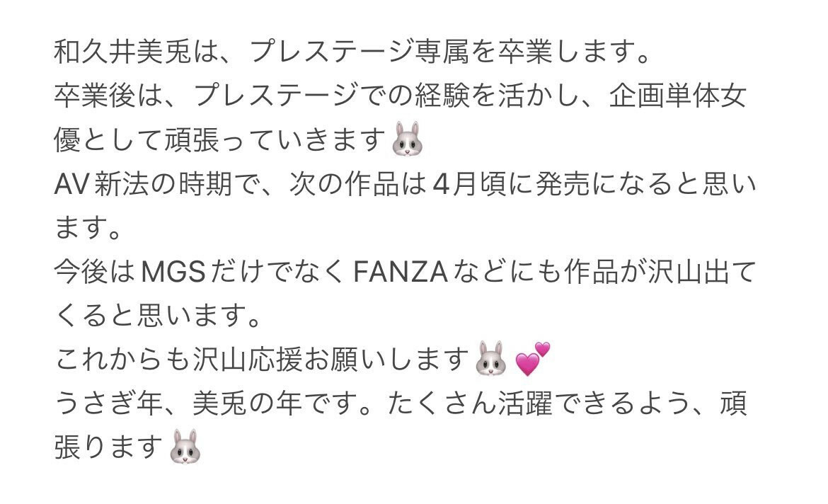 這大概可以解釋為什麼在1月的「ひたすら生でハメまくる、終らない中出し性交。」後,和久井美兎2月沒有在蚊香社發片的原因,而她也在twitter上說因為AV新法的緣故,她的新片要到4月才會上市,屆時大家就可以在FANZA看到她精彩的演出了(因為Presitge的作品在FANZA只有通販,串流看不到):
