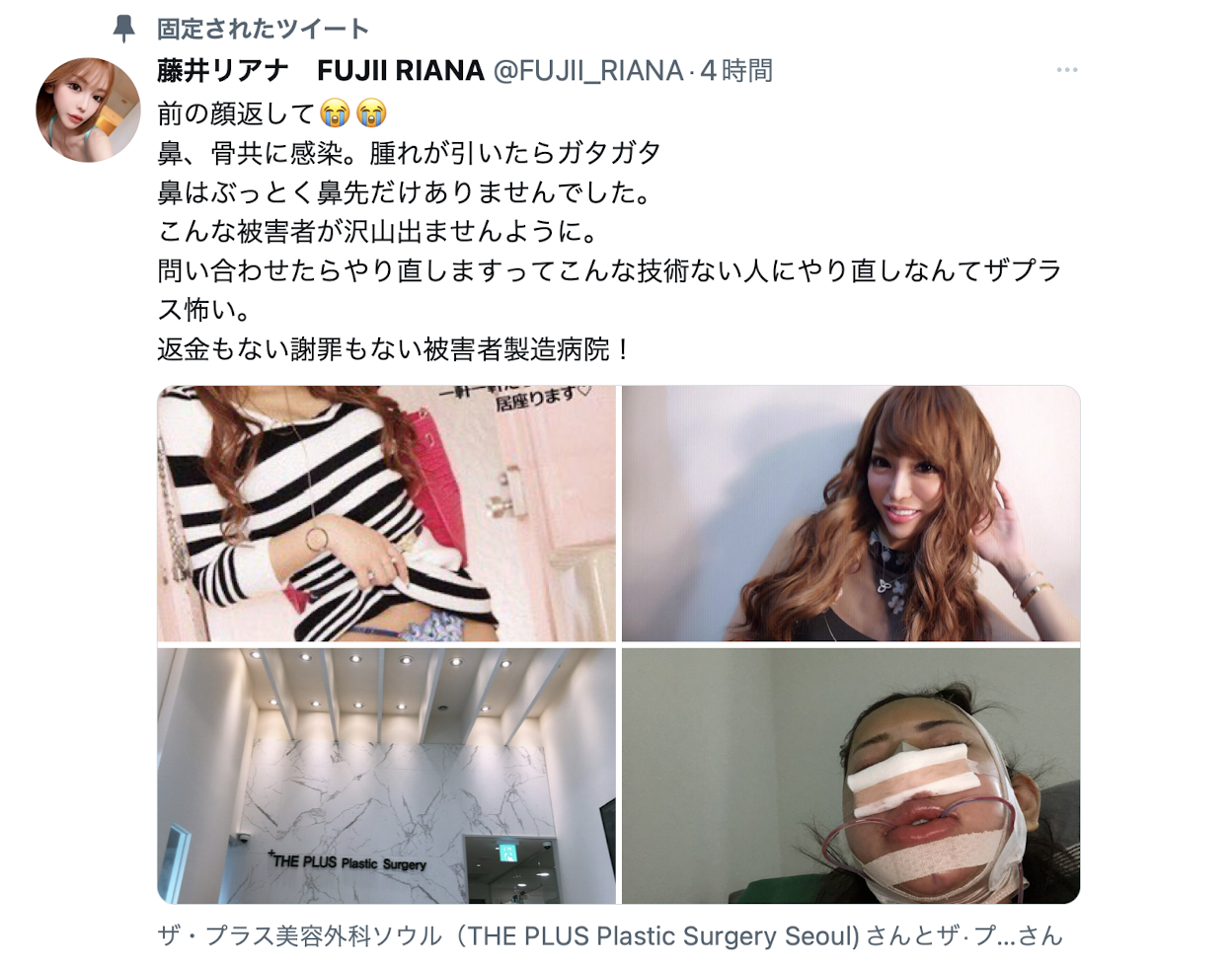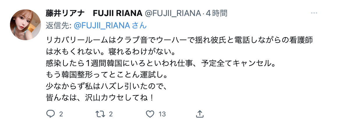 很慘,真的很慘,不只被整壞了,藤井リアナ(藤井梨亞奈)還抱怨診所的環境很差,在病房竟然可以感受到有如夜店般的電子樂震動感;然後因為感染,她被要求留下來追蹤觀察,就這樣來不及回去日本(對,她去韓國整形,其實蠻多女優去韓國都是這檔事),身體不舒服加上原本預定好的工作因為行程延誤而取消,再加上護士沒有給水喝,她只能打電話和男朋友抱怨並且直呼到韓國整形根本就是碰運氣,而她抽到了下下籤〜