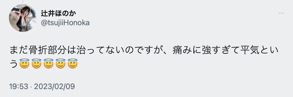 不久前辻井ほのか(辻井穗乃果)更新了twitter,說自己以デンジ(淀治,鏈鋸人チェンソーマン的主人翁)的回復力快速康復中,雖然骨折的地方還是會痛,但她沒事了,非常感謝大家關心〜