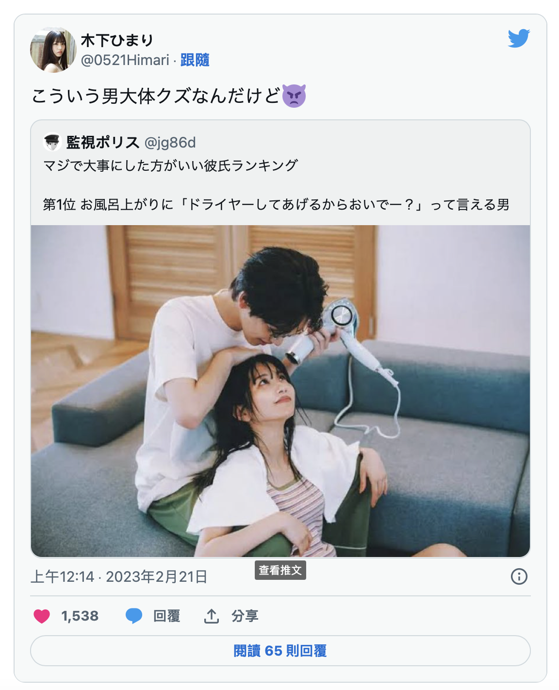 twitter帳戶「監視ポリス」這篇推文是這麼說的:妳應該珍惜的男人排行榜冠軍,就是會在妳洗完澡後說「我來幫妳吹頭髮」的男人,但對此木下ひまり(木下日葵)的看法是ー