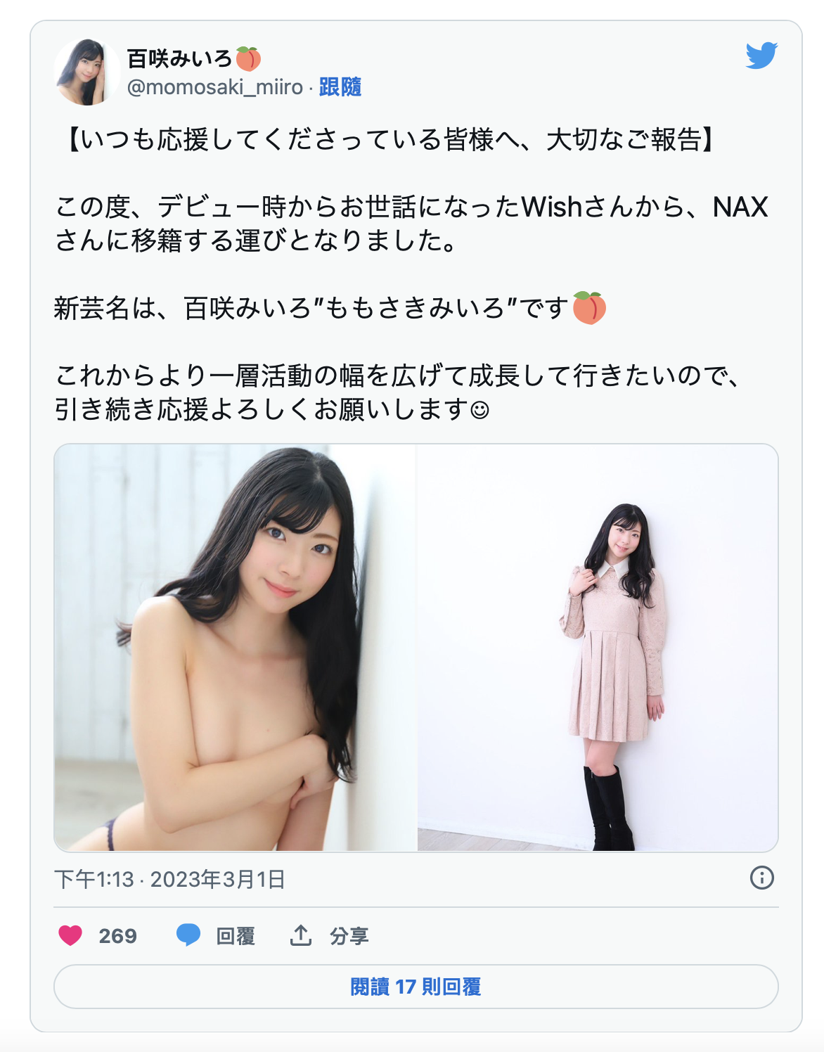 接下來我們看這位百咲みいろ(百咲未色),twitter上寫了,她是從原來的事務所Wish跳槽去了NAX,藝名也從七咲みいろ(七咲未色)改為百咲みいろ(百咲未色),以我所了解的AV界,這個移籍應該沒有搞到兩間經紀公司翻臉,所以百咲みいろ(百咲未色)得以保留絕大多數的藝名,接下來就看看這位自稱中學就想當AV女優、被喻為「最強逆封殺(就是本人比封面好看太多)」的女優如何用新的名字在業界立足:
