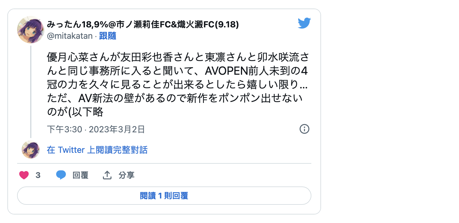 因為Diaz Group這間經紀公司的實力並不強,這一篇twitter的發文就講了,優月心菜去的是友田彩也香、卯水咲流和東凛在的經紀公司,這三位女優知名度高不高?高;但她們發展好不好?坦白說除了友田彩也香還待在FALENO集團的熟女片商DAHLIA外其他人的存在感很低;我沒有忘了水川潤(由愛可奈),同樣地,她也是在片商DAHLIA打拼,所以⋯