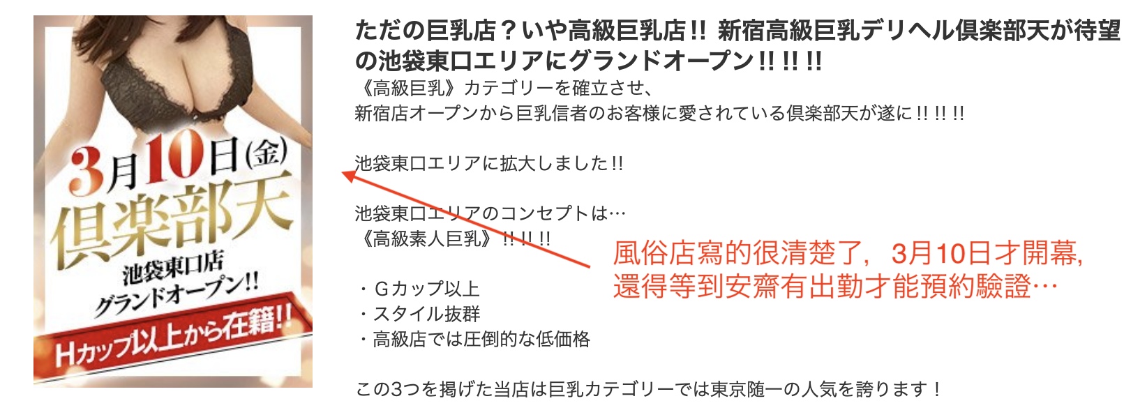 這是一間名為「天」的外送店,主打的是有名藝能人及AV女優在籍,而打出安齋らら(安齋拉拉)在店的是他們即將在池袋東口盛大開幕的新店,所以現在你問我是真是假的我也答不出來ー我沒有忘了去問經紀人,對方的答案和我想的一樣就是「確認します(我去確認一下)」然後就不再聯絡,以一般經紀人對女優在賣的事總是愛裝神秘的態度來看,應該是等不到答案惹〜