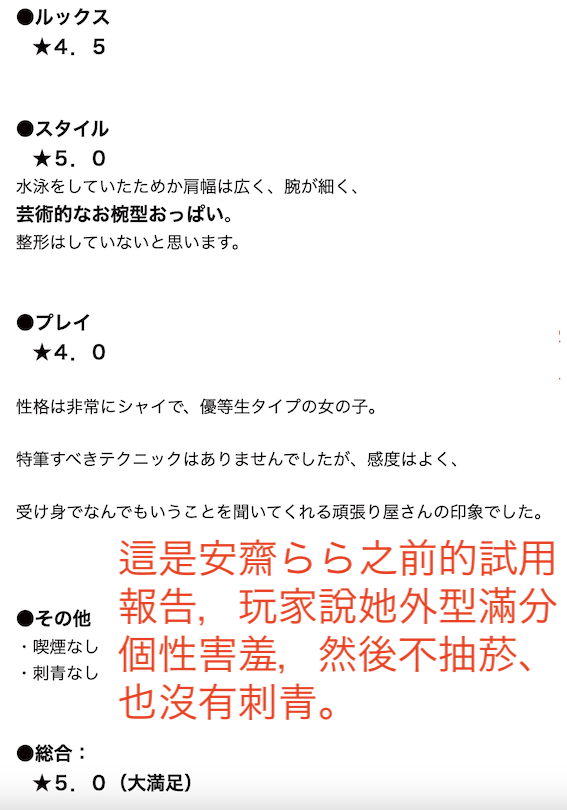 所以現在只有一個方法,就是這幾天就找個人殺過去等她出勤就預約出來看看是不是本人,我坦白說,雖然資料上的價格很便宜(90分鐘70,000円,折合台幣16,000元左右),但一般我所知道的AV女優價格就真的差不多那樣,也就是說不要因為身價不符合我們對安齋的想像就覺得那一定不是她,尤其如果你有在看女優風俗情報的話就會發現2015年的時候就有人寫過安齋的試用報告,留言還有人扼腕說當時沒喝到這杯又香又濃的奶奶奶奶奶奶奶荼: