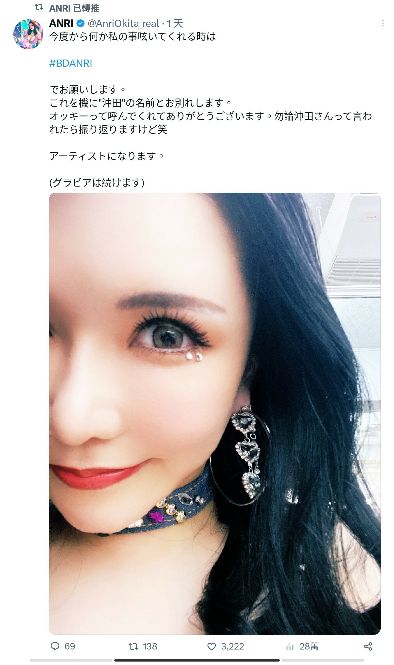 為什麼?沖田杏梨之前的事務所說並沒有要求必須改名,而是ANRI順勢拿到這個陪伴自己到現在的藝名以示追逐夢想全力發展藝人工作的決心(偶像團體、寫真、付費粉絲團)ー坦白說,看到佐山愛和ANRI兩位成員時我實在蠻驚訝,一般這種年紀的女優大多藏龍藏到能不公開露面就不要,想不到這兩位女優竟然願意和年輕人一起唱唱跳跳,真是太熱血啦〜