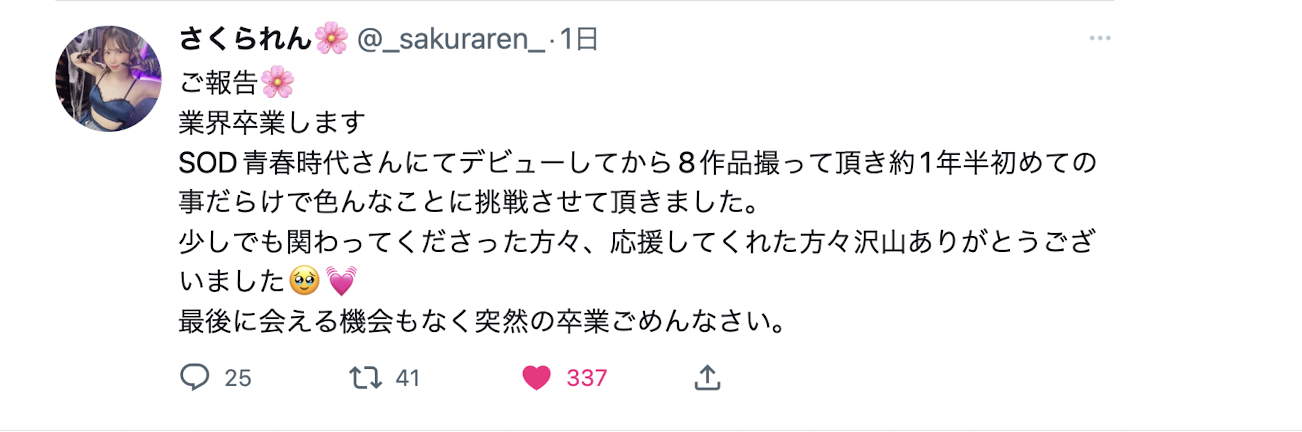 所以「アダルト模擬店OKの学園祭《夜の部》は制服メンズエステOPEN!校内No.1の美少女がオールナイトでクラスメイトのチ〇ポしゃぶりまくり! 」就是她的最後一支作品了:其實能被業界頂尖的經紀人看上,さくられん(佐倉戀)的條件並不差,我覺得如果以企劃女優的身分去拼發片應該也能有所成績,不過從她的訣別書就能看出一年半的時間只拍了8支作品,她的生涯被AV新法影響得很厲害,可能好不容易渡過發片空窗期後就無心了: